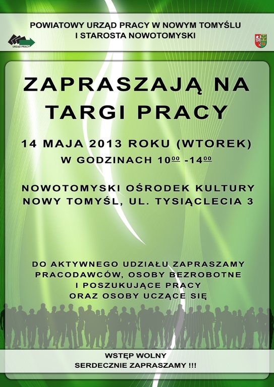 Uprzejmie informujemy, że Powiatowy Urząd Pracy w Nowym Tomyślu w dniu 14 maja 2013 roku organizuje Targi Pracy, które odbywać się będą w Nowotomyskim Ośrodku Kultury, ul. Tysiąclecia 3, 64-300 Nowy Tomyśl w godzinach 10.00 -14.00.
