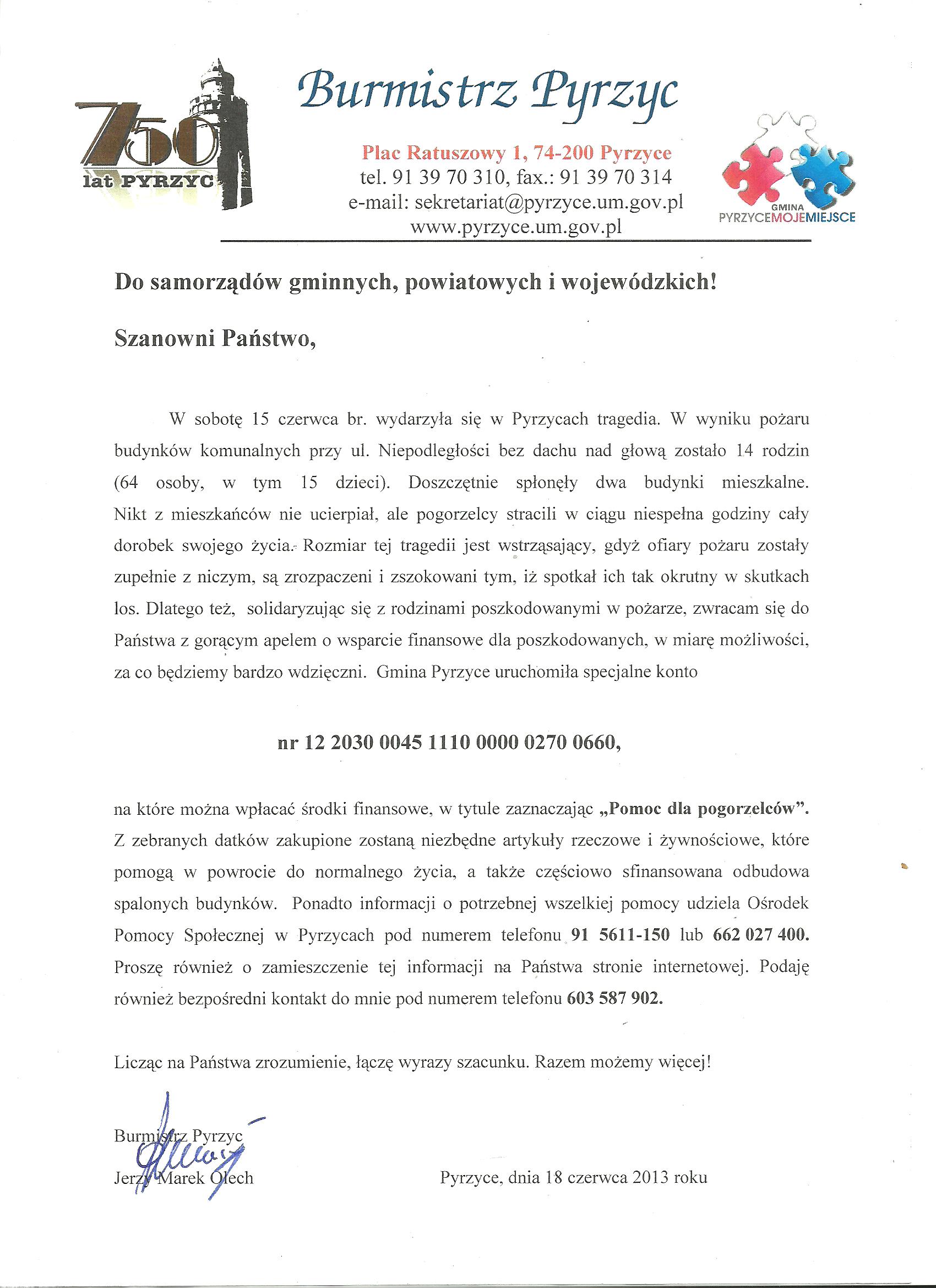 Nikt z mieszkańców nie ucierpiał, ale pogorzelcy stracili w ciągu niespełna godziny cały dorobek swojego życia. Rozmiar tej tragedii jest wstrząsający gdyż ofiary pożaru zostały zupełnie z niczym, są zrozpaczeni i zszokowani tym, iż spotkał ich tak okrutny w skutkach los. Dlatego też, solidaryzując się z rodzinami poszkodowanymi w pożarze, zwracam się do Państwa z gorącym apelem o wsparcie finansowe dla poszkodowanych, w miarę możliwości, za co będziemy bardzo wdzięczni. Gmina Pyrzyce uruchomiła specjalne konto: