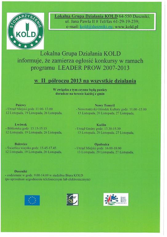 informuje, że zamierza ogłosić konkursy w ramach programu LEADER PROW 2007-2013