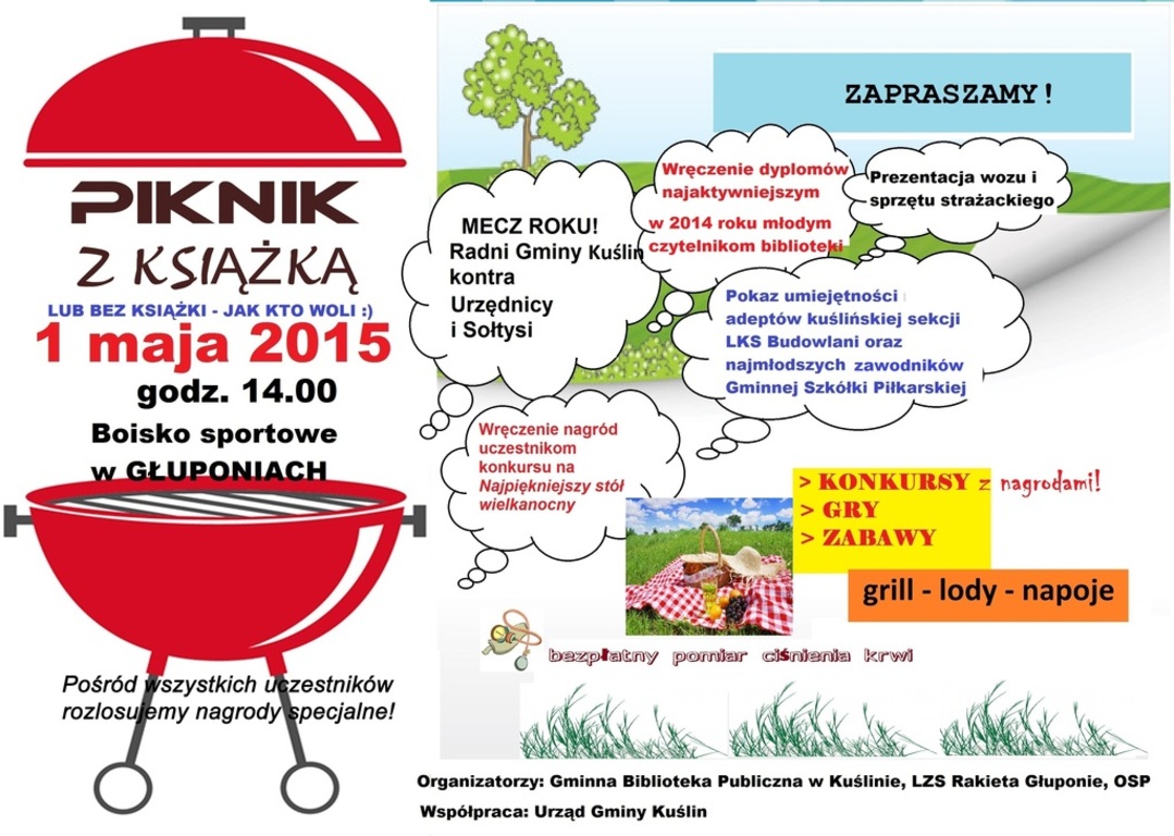 PIKNIK Z KSIĄŻKĄ Opublikowano: 28 kwietnia 2015 13:50 Kategoria: Aktualności WydrukujDo góry Wyświetleń: 894 Zobacz również Święto Konstytucji 3 Maja w Kuślinie -... Fotorelacja XII Targi Ogrodniczo-Działkowe...Konkurs na najlepszy film promujący gminę KuślinPIKNIK Z KSIĄŻKĄOstrzeżenie meteorologiczne - burze z grademOgłoszenie VII Sesja Rady Gminy w Kuślinie