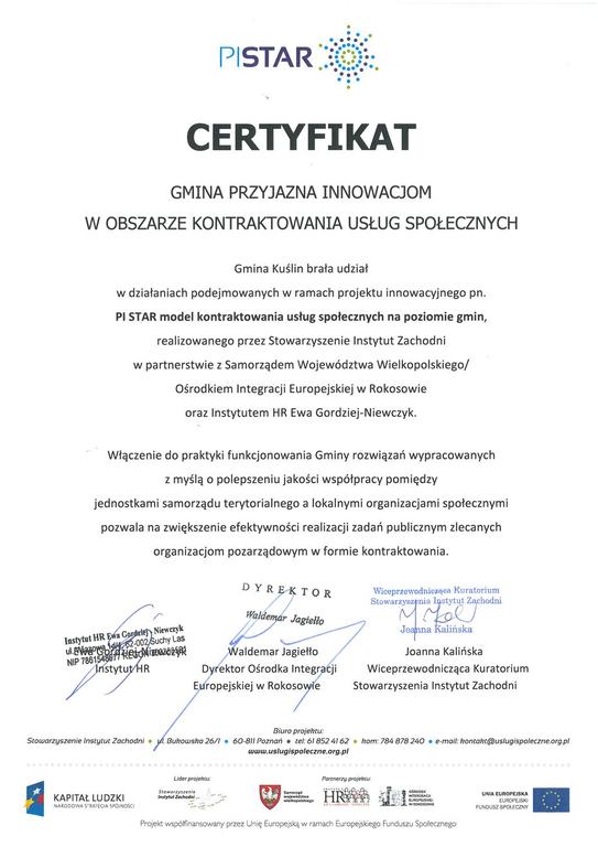 CERTYFIKAT GMINA PRZYJAZNA INNOWACJOM W OBSZARZE KONTRAKTOWANIA USŁUG SPOŁECZNYCH