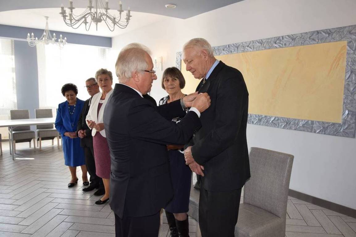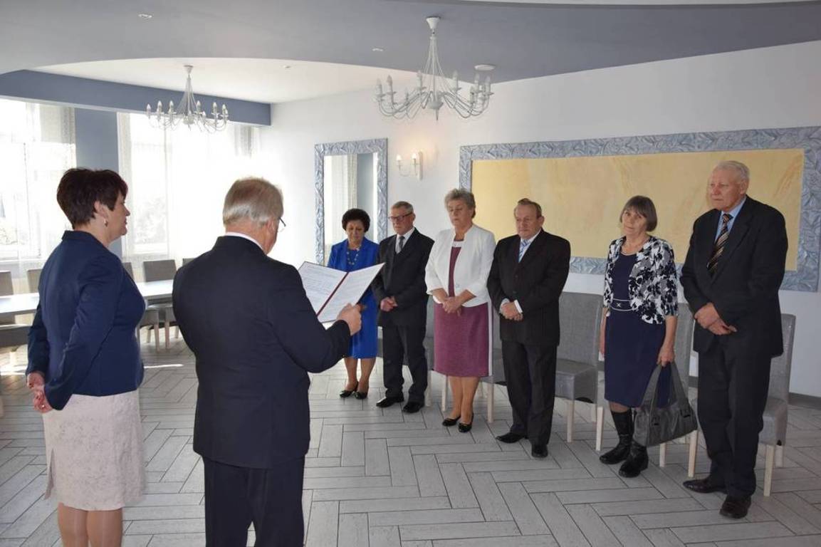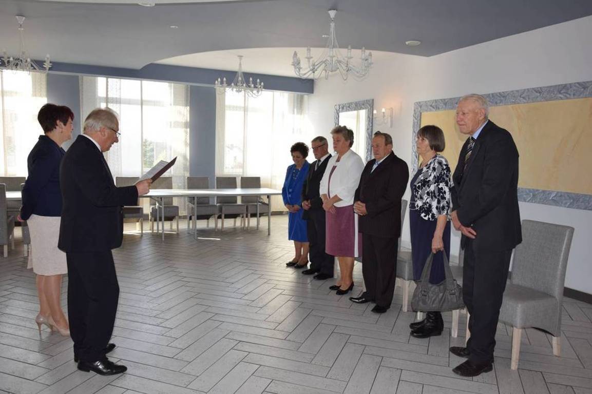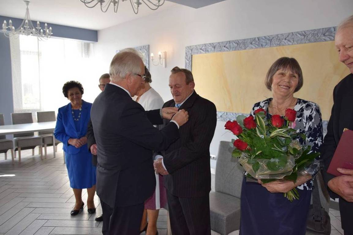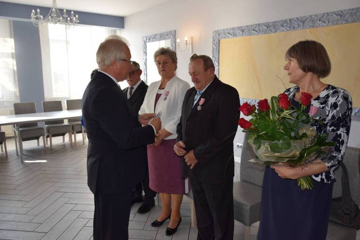 Wójt Gminy Kuślin Pan Jerzy Dziamski wraz z Kierownikiem Urzędu Stanu Cywilnego Panią Elżbietą Zimną wręczyli odznaczenia i złożyli życzenia następującym Jubilatom :